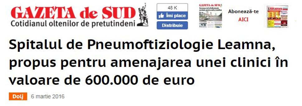 6 Martie 2016 / Anca Dumistrașcu / http://www.gds.ro/Local/Dolj/2016-03-06/spitalul-de-pneumoftiziologie-leamna,-propus-pentru-amenajarea-unei-clinici-valoare-de-600.000-de-euro/